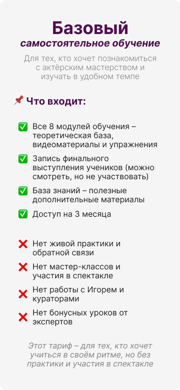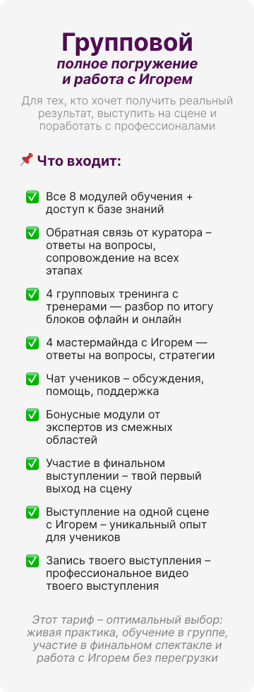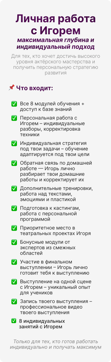 Вы попробуете актёрские практики, почувствуете работу тела и голоса, разберёте свой запрос — и получите первый результат уже на встрече.